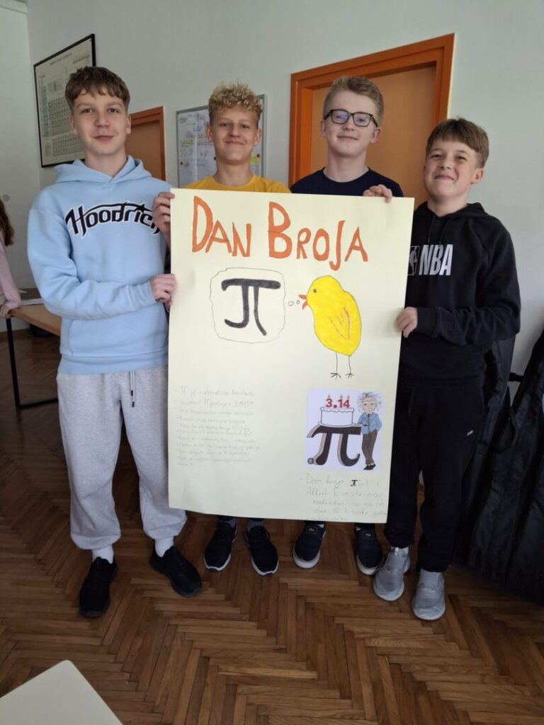 Naši učenici sedmoga razreda su istraživanjem i izradom plakata obilježili Dan broja π, jedan od najzanimljivijih i najkreativnijih “matematičkih praznika”. Ovaj datum (3/14) simbolizira približnu vrijednost broja π (3,14), beskonačnog i iracionalnog broja koji ima ključnu ulogu u matematici, fizici i inženjerstvu.